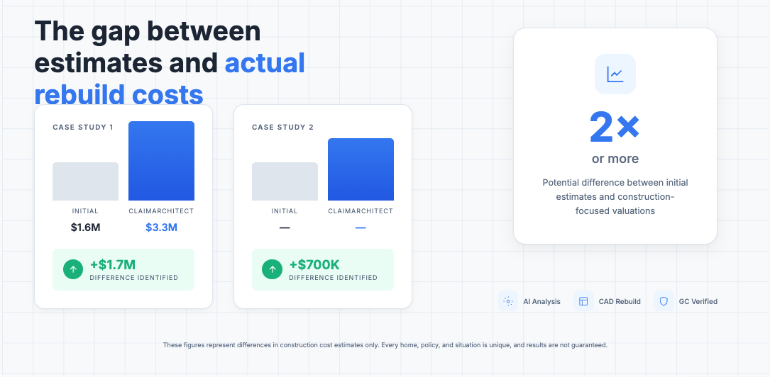 ClaimArchitect is available for a flat fee with a money-back guarantee if the valuation doesn't exceed the homeowner's existing estimate. The service is designed for high-value homes with potential rebuild costs in the high six figures or above. ClaimArchitect provides construction cost estimates only and does not interpret coverage, provide legal advice, or negotiate with insurers.