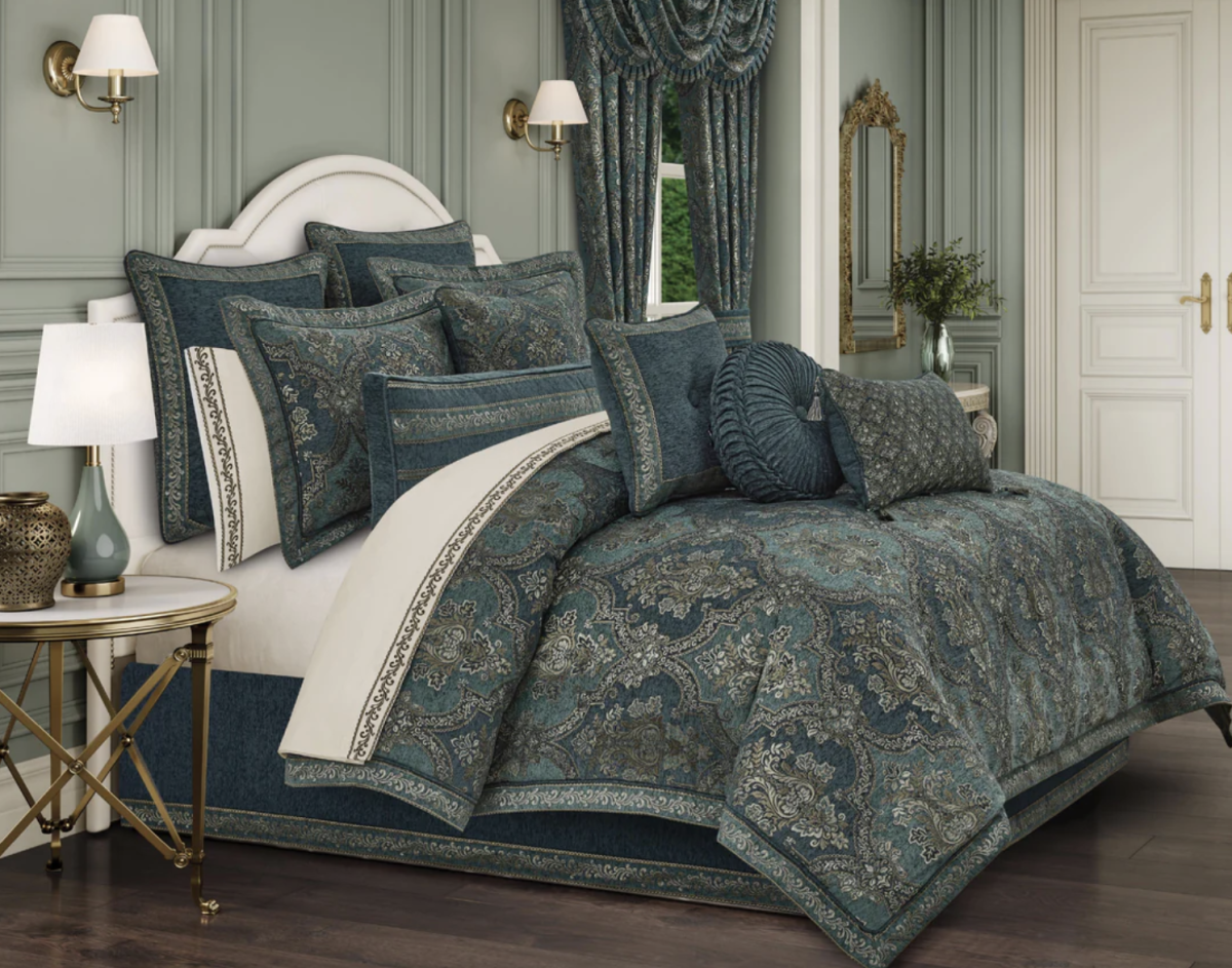 The Sofia Wedgewood and Nancy Teal comforter sets feature woven fabric textures and coordinated components designed to create a finished presentation. Each set includes matching shams and tailored elements that support symmetry across the bed. Color palettes lean toward rich, established tones that fit formal bedrooms and guest spaces.